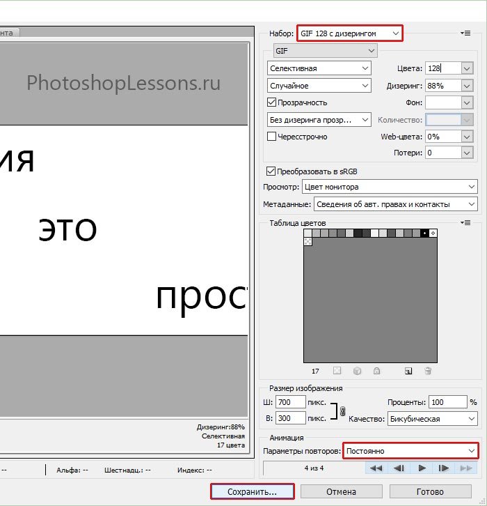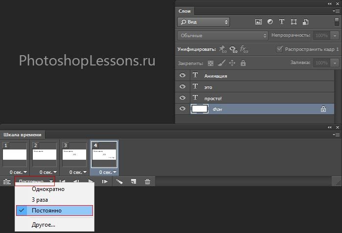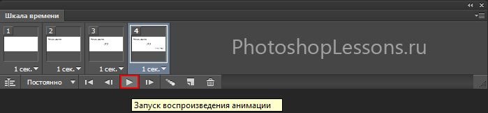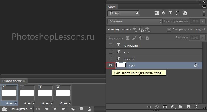 | Создание анимации в Photoshop CCВ этом уроке мы рассмотрим базовое создание анимации в Photoshop CC. Создаем новый файл с размерами 700 x 300 px. Открываем окно Timeline (Window - Timeline (Окно - Шкала времени)). Нажимаем на кнопку «Create Frame Animation» (Создать анимацию кадра). ![]() Используя инструмент Type Tool (Инструмент «Горизонтальный текст» / Клавиша «T») создаем 3 слоя с текстом («Анимация», «это», «просто»). Инструментом Move Tool (Инструмент «Перемещение» / Клавиша «V») размещаем текст как на изображении ниже. ![]() В окне Timeline (Шкала времени) выбираем первый кадр и нажимаем на кнопку «Duplicates selected frames» (Создание копии выделенных кадров). ![]() Создаем 4 копии выделенных кадров. ![]() Далее в окне Timeline (Шкала времени) выбираем первый кадр и в окне Layers (Window - Layers (Окно - Слои)) отключаем для кадра видимость всех слоев кроме фона. ![]() Выбираем в окне Timeline (Шкала времени) второй кадр и оставляем видимыми только слои «Анимация» и «Фон». Далее выбираем третий кадр и оставляем в нем видимыми слои «Анимация», «это» и «фон». Выбираем четвертый кадр и оставляем в нем видимыми все слои. Далее выставляем время отображения для каждого кадра в 1 секунду. ![]() Зададим параметр повтора нашей анимации. В меню окна Timeline (Шкала времени), меняем параметр повтора с «Однократно» на «Постоянно» (изображении ниже). ![]() Теперь мы можем использовать запуск воспроизведения анимации. ![]() Нам осталось только сохранить нашу анимацию в формате, который её поддерживает (.gif). Переходим через меню File - Save for Web (Файл - Сохранить для Web / Alt+Shift+Ctrl+S) выставляем настройки как на изображении ниже и нажимаем «Сохранить». ![]() ![]() |