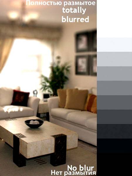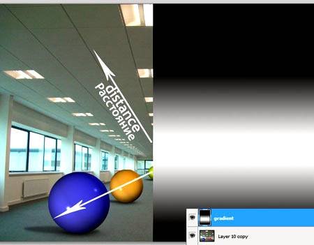| Как создать реалистичную глубину резкостиВ этом уроке, мы рассмотрим, как создать реалистичную глубину резкости в программе Photoshop. Когда приходится создавать глубину резкости в программе Photoshop, многие пользователи применяют «размытие по Гауссу» или другие технические приёмы, после применения которых, эффект с трудом выглядит как реалистичный или близко даже нет к той глубине резкости, которую создаёт настоящая камера. Я предлагаю вам в начале полностью прочитать урок, как только вы его осмыслили, прочитайте его ещё раз и попробуйте уже сами. Используя «размытие по Гауссу» для создания «Глубины Резкости» не самый хороший способ для достижения и вы чётко это видите на краях объектов и мелких деталях. Посмотрите на изображение ниже, которое приведено в качестве примера. Как вы можете увидеть, Размытие при малой глубине резкости выглядит более реалистично. ![]() Что такое карта глубины?Карта глубины в программе Photoshop это ничего более, чем изображение серой шкалы, которое используется в качестве альфа канала. Карту глубину можно применять через фильтр Filter - Blur - Lens Blur (Фильтр - Размытие - Размытие при малой глубине резкости), чтобы создать «выборочное размытие». Фильтр применяет различную степень размытия к каждому оттенку серого. На более тёмных оттенках серого, будет меньше применяться размытие к вашему изображению. Посмотрите на изображение, расположенное ниже. Градиент справа – это используемый градиент, в качестве альфа канала. ![]() Имитация глубины резкости на различных расстоянияхДля получения реалистичного эффекта глубины резкости в программе Photoshop, вы должны применить различную степень размытия на объектах в зависимости от их расстояния до камеры, точно так же, как будто до настоящей камеры. Мы собираемся сделать это с помощью карты глубины. Мы вручную создадим карту глубины, путём наложения различных оттенков серого на объекты в зависимости от их удалённости. На нашей карте глубины, самые близкие объекты будут темнее, а объекты, которые расположены подальше будут в более светлых оттенках серого. Практический примерЯ взял фото и поместил несколько шаров на различном удалении. ![]() Создание карты глубиныСледующий шаг – создание карты глубины. Как я уже говорил, единственный способ это сделать – это самим его создавать, потому что мы хотим, чтобы заполнение было серыми оттенками. Просто взять и превратить изображение в чёрно-белое не поможет. Оттенки серого, которые вы применяете к каждому объекту, в действительности зависят от того, какой объект вы хотите сфокусировать и соответственно закрасить этот объект в чёрный цвет. Например, если вы хотите, чтобы был сфокусирован жёлтый шар. Вы должны закрасить его в чисто чёрный цвет, а другие шары в различные оттенки серого, в зависимости от их удалённости от жёлтого шара. Немного запутано, но если вы увидите это, то это легко понять. Первое, что вы должны сделать, это создать новый слой и нарисовать градиент от чёрного к белому в зависимости от того, какую глубину резкости вы хотите получить. На моей фотографии, окно в конце коридора самое удалённое от камеры, потолок и пол постепенно приближаются к камере. Таким образом, я создал свой градиент (я удалил половину градиента, так что вы можете увидеть, как он выглядит в палитре слоёв над существующим изображением). Примечание пере