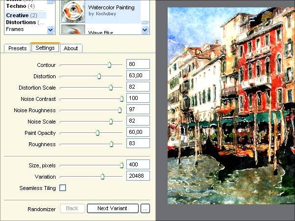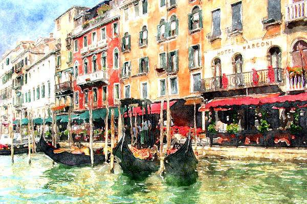 | Создаем акварельный рисунок из фотографииВ этом уроке мы рассмотрим, как из обыкновенной фотографии сделать акварельный рисунок – быстро и просто. Я буду использовать: Adobe Photoshop, плагин Filter Forge и фото. Шаг 1. Открываем исходное изображениеЗапускаем Photoshop. Затем жмем Ctrl+O и открываем картинку, которую будем модифицировать. Я использовала фотографию, сделанную в Венеции с помощью недорогой камеры Canon. ![]() Шаг 2. Добавляем насыщенности цветамДобавим насыщенности: Image - Adjustments - Hue/Saturation (Изображение - Коррекция - Цветовой тон/Насыщенность / Клавиши «Ctrl+U»). Этот шаг является необязательным. Если Ваше изображение не требует коррекции, можете пропустить этот шаг. ![]() Шаг 3. Применяем фильтр «Watercolor Painting»Теперь будем применять к нашему изображению фильтр Watercolor Painting. Запускаем плагин Filter Forge (Filter - Filter Forge). Если у Вас нет плагина Filter Forge, скачайте его на официальном сайте разработчика //www.filterforge.com/download/ и установите программу на компьютер. Затем идем на страницу фильтра //www.filterforge.com/filters/7227.html и жмем кнопку «Open in Filter Forge». Запустится «Filter Forge» и начнется закачка фильтра (26,3 KB). ![]() Шаг 4. Подбор параметров фильтраИтак, мы скачали нужный фильтр. Попробуем подобрать наиболее подходящие к нашей картинке параметры. Для начала, пробую применить пресеты, сделанные автором фильтра (закладка Presets (Наборы)) – двойной клик на превьюшку применяет эффект к нашему изображению. Я нашла нечто подходящее, но хочу еще покрутить параметры. Перехожу на закладку Settings (Настройки) и начинаю двигать слайдеры. Есть еще одна замечательная штука – Randomizer and button Next Variant. Можно просто жать на эту кнопку до тех пор, пока не попадется подходящая комбинация. Но я не стала дожидаться удачи и остановилась на таких: ![]() Жмем кнопку Apply и наша картинку превращается в некое подобие акварельного рисунка. Шаг 5. Смотрим промежуточный результатТеперь внимательно смотрим на результат. Могу сказать, что мне не нравятся «грязные» разводы на воде в районе отражений лодок. Полагаю, тут потребуется некоторая коррекция нашего изображения. ![]() Шаг 6. Делаем маскуОтменяем последнее действие (применение фильтра) - Ctrl+Z. И приступаем к цветокоррекции нашего изображения. Переключаемся в режим Quick Mask Mode (Q) и закрашиваем мягкой кистью области, которые останутся без изменения. В нашем случае – это все, кроме воды. ![]() Шаг 7. Добавим контрастностиПереключаемся в нормальный режим редактирования Edit in Standard Mode (Q). И инвертируем выделение Select - Inverse (Выделение - Инверсия / Сочетание клавиш «Shift+Ctrl+I»). Затем открываем диалог Image - Adjustments - Levels (Изображение - Коррекция - Уровни / Сочетание клавиш «Ctrl+L») и двигаем ползунки таким образом, чтобы получить более контрастное изображение. Обычно это достигается путем смещения крайних ползунков к середине. ![]() Шаг 8. Добавим резкостиНу и чтобы совсем было хорошо, пройдемся по воде Sharpen Tool (Инструмент «Резкость») большого диаметра и с мягкими краями. ![]() Шаг 9. РезультатТеперь запустим «Filter Forge» плагин. И снова применим фильтр «Watercolor Painting». Вот и все. ![]() |