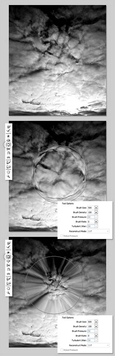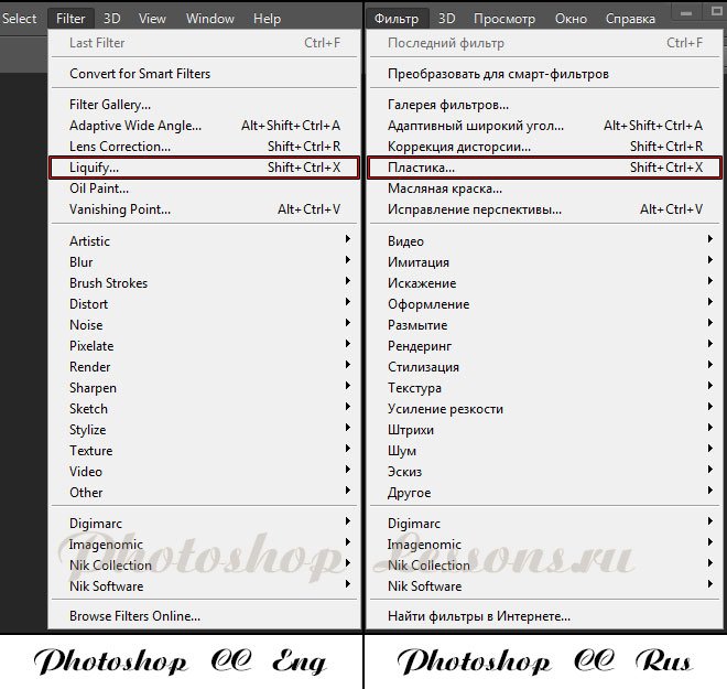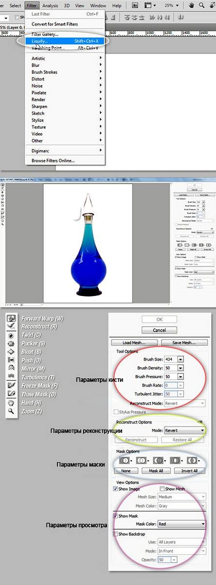 | Фильтр «Liquify» (Пластика)В этом уроке мы подробно рассмотрим фильтр «Liquify» (Пластика) в Фотошопе. ![]() Фильтр Liquify (Пластика) является одним из наиболее часто используемых фильтров в Photoshop. Этот фильтр позволяет искажать пиксели изображения без потери его качества. Некоторых пользователей немного пугает фильтр Liquify (Пластика), другие же используют его не совсем правильно. Сейчас вы узнаете возможности это мощнейшего фильтра в подробностях и сможете применять его в ваших работах. Что представляет собой фильтр ПластикаНачиная с ретуши фотографий до создания сложных профессиональных эффектов, фильтр Пластика является мощнейшим инструментом для каждого пользователя Photoshop. Этот фильтр позволяет сдвигать, перемещать, поворачивать, отражать, делать вздутие и сморщивание пикселей любого изображения. Сегодня вы познакомитесь с основами этого фильтра. Запаситесь изображениями для тренировки, пробуйте делать описываемые действия по мере прочтения этого урока. Давайте приступим! Фильтр Liquify (Пластика) может быть применен к любому растровому слою, но к сожалению не может быть применен к смарт-объектам. Вы можете открыть фильтр Liquify (Пластика) выбрав в меню Filter - Liquify (Фильтр - Пластика) или нажав Shift+Ctrl+X на вашей клавиатуре. Когда вы откроете фильтр Liquify (Пластика), то увидите окно, содержащее следующие области: 1) Панель инструментов, расположенную в левой части экрана. Там находятся следующие инструменты: Forward Warp (Деформация), Reconstruct (Реконструировать), Twirl (Скручивание), Pucker (Сморщивание), Bloat (Вздутие), Push (Смещение пикселов), Mirror (Отражение), Turbulence (Турбулентность), Freeze / Thaw Mask (Заморозить/Разморозить маску), Hand (Рука) и Zoom (Масштаб). 2) Изображение, которое вы редактируете. 3) Панель настроек, где можно редактировать параметры кисти, реконструкции, маски и просмотра. Каждая группа опций управляет поведением активного инструмента, вы узнаете как работать с этими опциями позднее. ![]() ИнструментыИнструмент Forward Warp Tool (Деформация / Клавиша «W»)Наиболее часто употребляемый инструмент в фильтре Liquify (Пластика) – это инструмент Forward Warp Tool (Деформация), который перемещает пиксели изображения в направлении, в котором вы продвигаете кисть. Вы можете управлять количеством перетаскиваемых пикселей изображения, изменяя Brush Size (Размер кисти) в настройках кисти на панели справа. Чем больше размер кисти, тем больше пикселей изображения будут перемещены. После того, как достигните нужного результата, нажмите кнопку Ok на панели справа, чтобы подтвердить изменения. ![]() Brush Density (Плотность кисти)Плотность кисти управляет тем, как происходит сглаживание воздействия от центра к краям при применении инструмента. По умолчанию эффект деформации сильнее в центре, и слабее на краях, вы можете изменять значение плотности кисти от 0 до 100. Чем больше это значение, тем сильнее воздействие кисти на края. ![]() Brush Pressure (Нажим кисти)Нажим кисти управляет быстротой, с которой происходит деформация по мере перемещения кисти по изображению. Можно установить значение от 0 до 100, значение 0 соответствует самому слабому нажиму, 100 – максимальному. При использовании небольшого значения нажима кисти изменения происходят более медленно, и тогда вам будет легче остановить воздействие в нужный момент. ![]() Инструмент Twirl Tool (Скручивание / Клавиша «C»)Этот инструмент фильтра вращает пиксели изображе