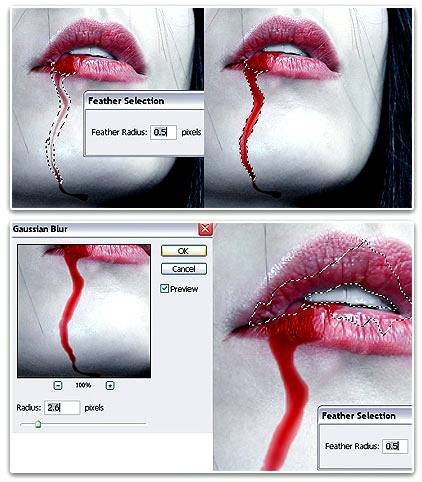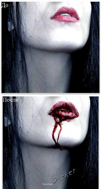 | Рисуем реалистичную кровьВ данном уроке Фотошопа мы используя данное изображение создадим эффект реалистичной крови с тенями, динамично стекающей с губ. Без плоских оттенков. Кровь будет струиться по коже от губ, заканчиваясь небольшой каплей на подбородке. ![]() Основные инструменты/фильтры, необходимые для придания реалистичного вида крови: Variations (Вариации); History Brush Tool (Инструмент «Архивная кисть» / Клавшиа «Y»); Blur Tool (Инструмент «Размытие») Sharpen Tool (Инструмент «Резкость»); Smudge Tool (Инструмент «Палец»); Spot Healing Brush Tool (Инструмент «Точечная восстанавливающая кисть» / Клавиша «J»); Dodge Tool и Burn Tool (Инструменты «Осветлитель» и «Затемнитель» / Клавиша «O») ![]() 1.Выберите инструмент Lasso Tool (Инструмент «Лассо») в панели инструментов. Отмечу, что вам нужно уделить особое внимание кривым линиям участка, на котором вы будете использовать инструмент Lasso (Лассо) ![]() 2.Перейдите в меню Image - Adjustments - Variations (Изображение - Коррекция - Варианты). Здесь вы выберете цвет, насыщенность и яркость крови. Я предпочитаю кровь более темных и холодных оттенков, но на данном этапе вы можете выбрать настройки на свое усмотрение. ![]() ![]() Переходим к смягчению: подходящим инструментом для этого будет инструмент History Brush Tool (Инструмент «Архивная кисть» / Клавшиа «Y»). 3.После того, как вы установите подходящий цвет, выберите инструмент History Brush Tool (Инструмент «Архивная кисть» / Клавшиа «Y») в Панели инструментов (значения Opacity (Непрозрачности) и Flow (Интенсивности) не должны быть высокими), затем тщательно проведите ей только по краям крови (например, там, где естественная тень кожи смешивается с красным цветом). Ваша задача состоит не в том, чтобы стереть весь красный цвет, а в том, чтобы придать объем. Сглаживаемые края не должны быть прозрачными или слишком текстурированными. Выберите инструмент Lasso Tool (Инструмент «Лассо») 4.Далее последует непрерывный процесс использования инструмента Lasso ![]() 5. Схитрите…Реалистичная, объемная кровь требует реалистичности световых рефлексов. Это вполне выполнимо, но почему бы не упростить себе задачу и не воспользоваться тем, что уже есть? Губы являются отличным примером того, как здорово может выглядеть применение Variations (Вариаций) (в отличие от плоского красного цвета). Существующий свет на губах (как на этом изображении) может использоваться в качестве световых рефлексов крови. Текстура губ может играть ту же роль благодаря своим теням и светам. Тот же принцип применяется в случаях, когда вы хотите сделать эффект кровавых слез из глаз, обычно всегда в области нижнего края глаз есть участки с естественным светом. ![]() Помните, я говорил о том, что собираюсь получить растекающуюся, темную, плотную струю крови с небольшими сгустками внизу и по краям. Как только вы достигли желаемого результата струи крови и все вроде бы примет необходимую форму, потребуется добавить дополнительных световых рефлексов, проходящих от более темных и более светлых теней, которые придадут ощущение большей реалистичности. Вам потребуется 6 специальных инструментов: Burn Tool (Затемнитель) Dodge Tool (Осветлитель) Smudge (Палец) Sponge (Губка) Sharpen (Резкость) Spot Healing (Лечащая кисть); ![]() 6. Создание световых рефлексовОстановите свой взгляд на любом месте, где доминируют красные цветовые тона и любые похожие, которые кажутся слегка смешанными. Затем в панели инструментов выберите инструме