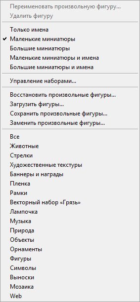 панели параметров вам уже знакомы, кроме самого главного — кнопки Фигура, щелчок на которой открывает окно выбора фигур.
