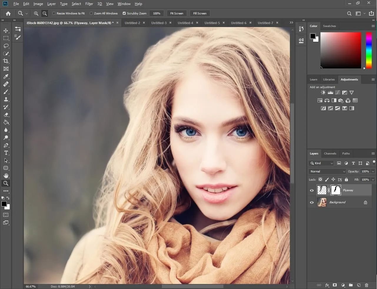 маску слоя черным цветом, чтобы проявить растрепанные пряди волос.