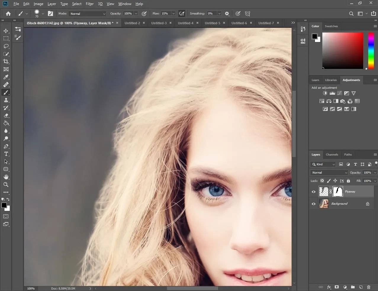 Увеличьте масштаб фото, чтобы при необходимости добавить или убрать мелкие пряди.