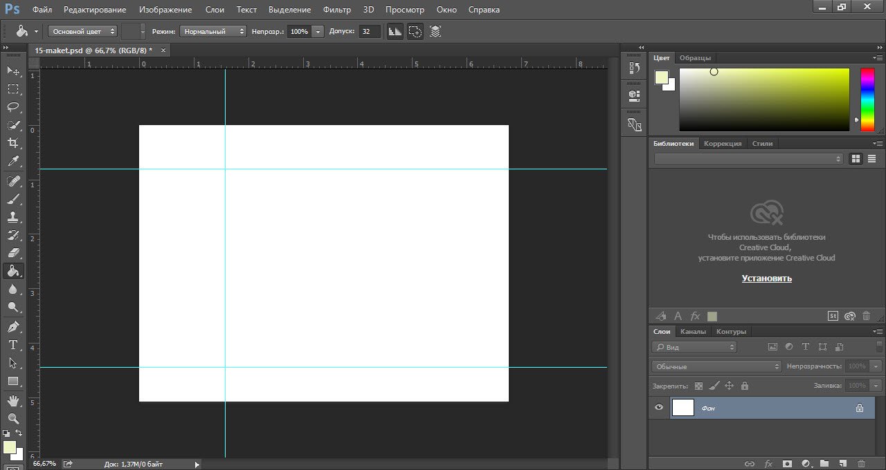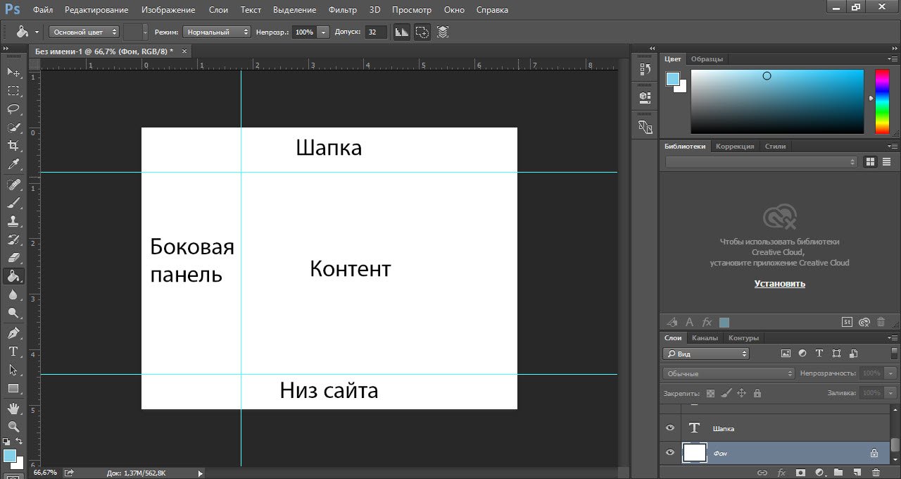 Разграничьте макет с помощью направляющих, вытягиваемых из линеек.