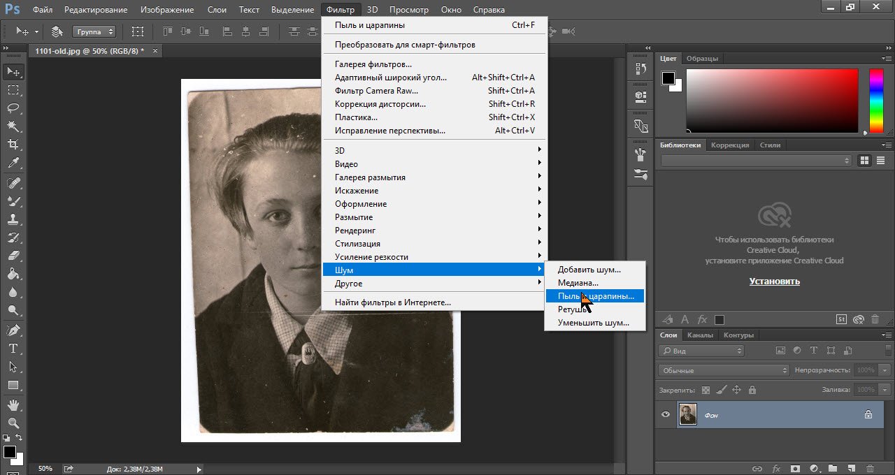 В главном меню программы выполните команду Фильтр -> Шум -> Пыль и царапины.