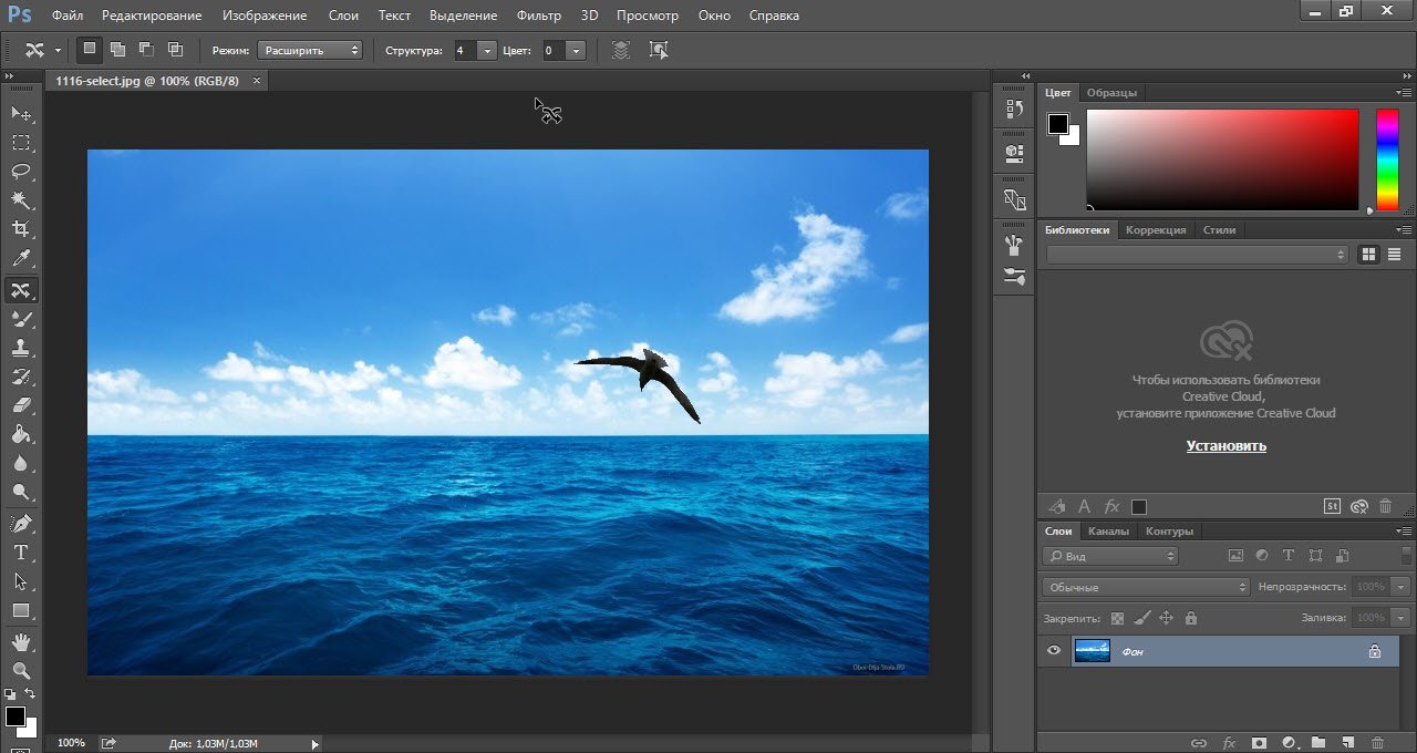 В одном из уроков мы вписывали чайку в морской пейзаж? Давайте теперь уберём её оттуда именно с помощью инструмента Заплатка.
