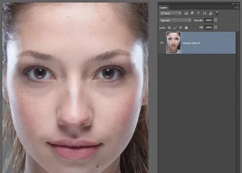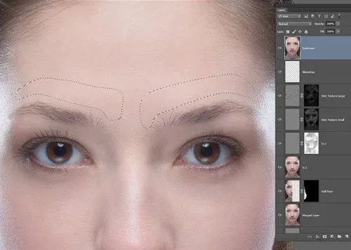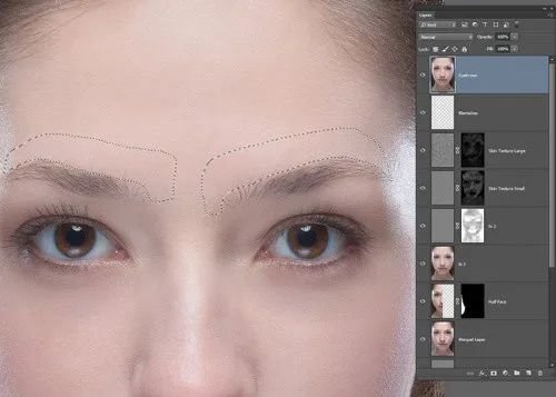 Нажмите Cmd / Ctrl + J, чтобы создать из выделенных областей новый слой, а затем переключитесь на инструмент «Перемещение» (V) и подвиньте слой вниз, пока не обрежете брови, как показано выше в примере ретуши фотографии в Фотошопе.
