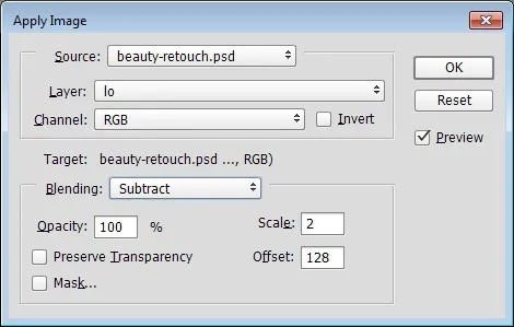 Чтобы начать ретушь в фотошопе мы дважды продублируем фоновый слой и растрируем каждый из этих дубликатов. Кликните правой кнопкой мыши и выберите пункт «Растрировать слой». Нижний слой я назвал “lo”, а верхний “hi”. К слою “lo” я применил «Размытие по Гауссу» с радиусом 10 пикселей, а затем выбрал слой “hi” и перешел в Изображение> Внешний канал. Использовал параметры, приведенные на скриншоте. Затем я установил для слоя “hi” режим смешивания «Линейный свет».