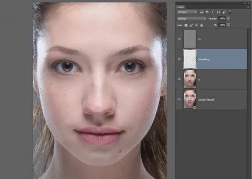 Создайте новый слой между слоями “lo” и “hi”. Назовите его “smoothing”. Затем выберите инструмент «Кисть» (B) и в панели параметров в верхней части окна программы установите непрозрачность кисти 10%.