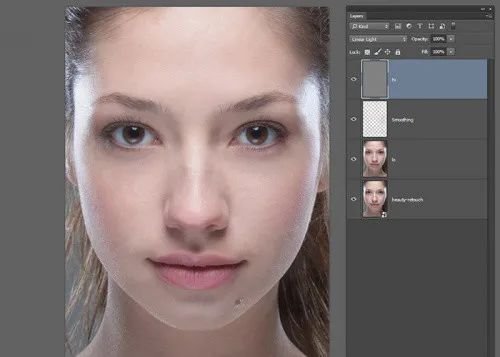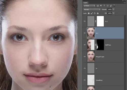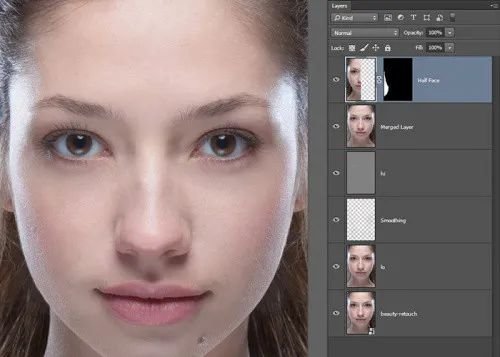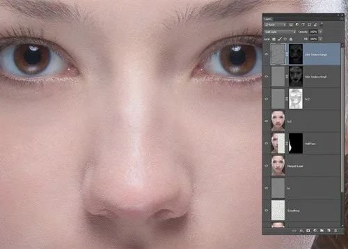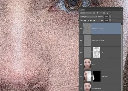 Начните со слоя с более мелкой текстурой, а когда закончите, зарисуйте области маски слоя с более крупной там, где вы хотите ее проявить. Это очень кропотливая ретушь лица в Фотошопе. Запаситесь временем и терпением. Удаляйте белые участки там, где текстура выглядит плоской или неестественной.