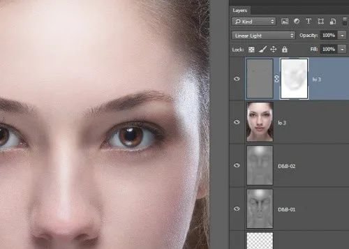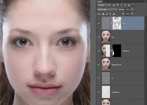 На данном этапе ретуши фото в Фотошопе я хочу обработать все места, где волосы соприкасаются с кожей, а также добавить глубину для всех углублений (вокруг глаз, по обе стороны носа, под губами, и т.д.). На втором скриншоте я установил для слоя осветления/затемнения режим смешивания «Нормальный», чтобы вы наглядно увидели, что я сделал.