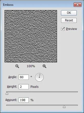 Для параметра «Распределение» задайте «Равномерное», установите флажок возле параметра «Монохромный». После этого перейдите в Фильтр> Стилизация> Тиснение и установите значения для «Угла» — 85 градусов, «Высоты» — 2 и «Эффекта» порядка 200%. Задайте для этого слоя режим наложения «Мягкий свет». Это наша базовая текстура.