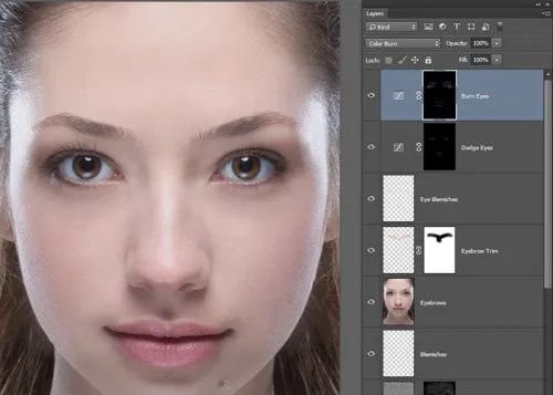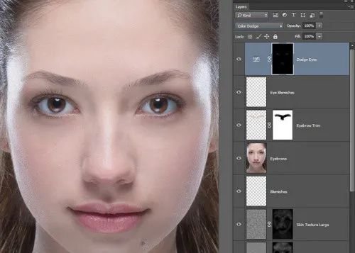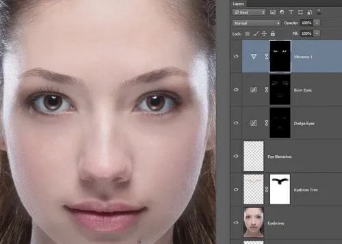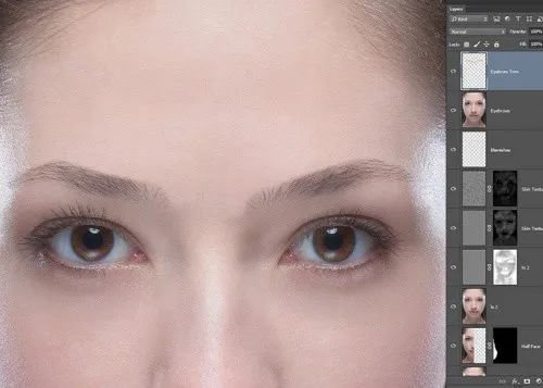 Кожа выше бровей выглядит не совсем естественно, потому что видны края бровей. Добавьте к слою “Eyebrow Trim” маску слоя, как показано выше, и зарисуйте кожу над бровями, чтобы проступили их края. Я использовал мягкую кисть среднего размера, чтобы зарисовать черным цветом и скрыть то, что нужно.