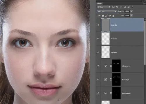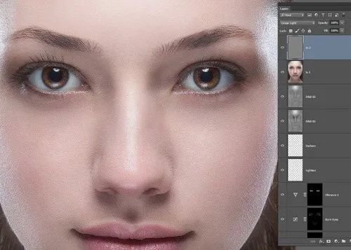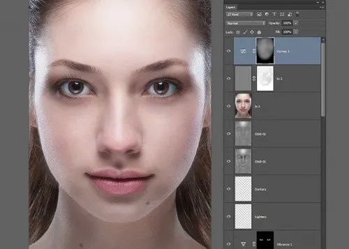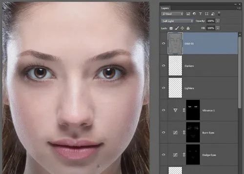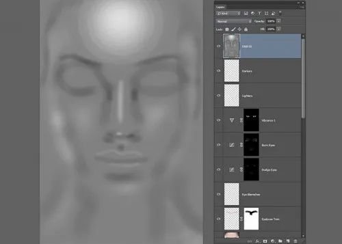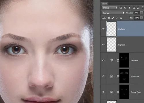 Скройте этот слой, нажав на маленькую иконку глаза, и проделайте то же самое для слоя «Darkers«, но в нем закрасьте черным цветом темные участки. Теперь сделайте оба слоя видимыми и установите для них режима наложения «Перекрытие». Уменьшите непрозрачность слоя «Darkers» до 20%, а «Brighters» до 40%.