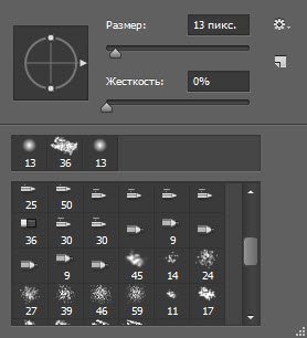 Щелчок на значке откроет доступ к настройкам кисти. Здесь можно выбрать кисть из уже готового набора или создать собственный шаблон. Вы можете задать форму, размер, жёсткость и угол наклона инструмента.