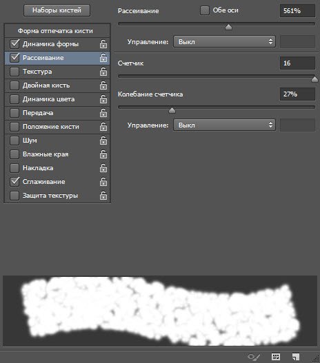 Рисование. Ползунок рассеивания позволяет менять плотность и ширину создаваемых линий. Счетчик устанавливает количество рассеиваемых элементов — чем больше значение, тем «гуще» рисует кисть. Колебания счетчика позволяют элементам разбрызгиваться неравномерно. Если установить флажок Обе оси, то краска будет распыляться ещё и по горизонтали.