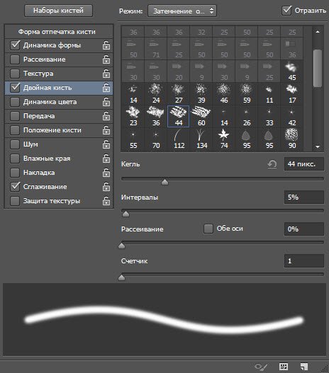 Двойная кисть. К основной кисти вы можете добавить ещё одну, настройки которой и задаются на этой вкладке.