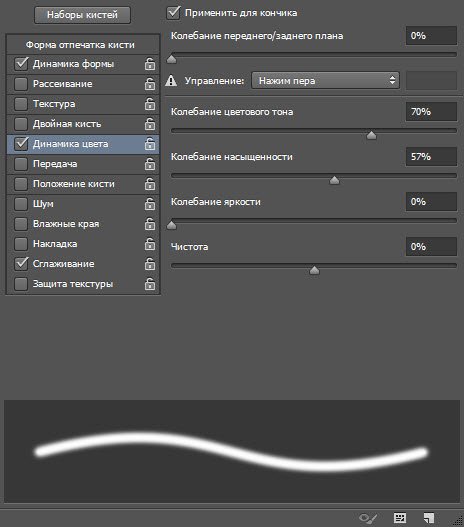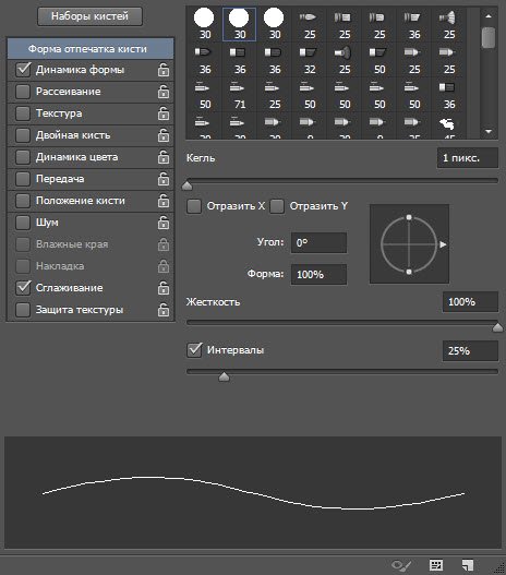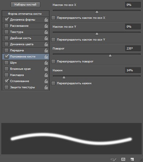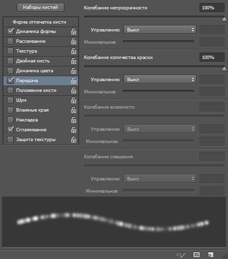 В левой части окна расположены вкладки-флажки, позволяющие настраивать, включать и отключать те или иные свойства кисти.