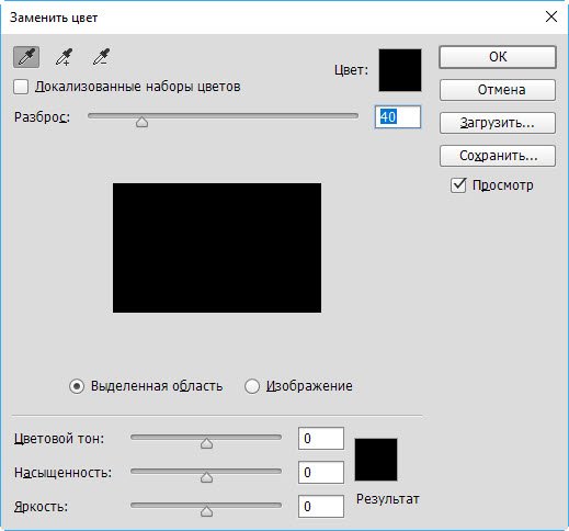 Инструмент позволяет перекрашивать уже созданные объекты, причём обилие настроек даёт возможность сделать это максимально качественно, с сохранением текстур. Изменить значения можно либо на панели параметров, либо в окне, для открытия которого служит команда главного меню программы Изображение -> Коррекция -> Заменить цвет.