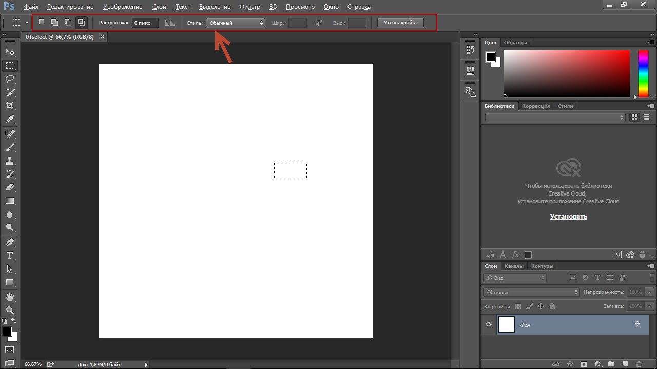 Например, для прямоугольного выделения доступны такие параметры, как режим работы, растушовка и стиль.