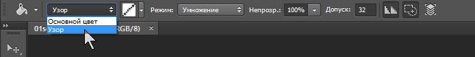На панели параметров инструмента Заливка выберите в качестве источника цвета узор.