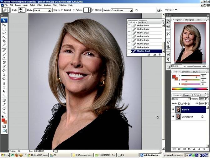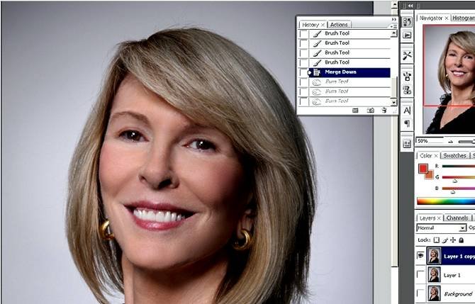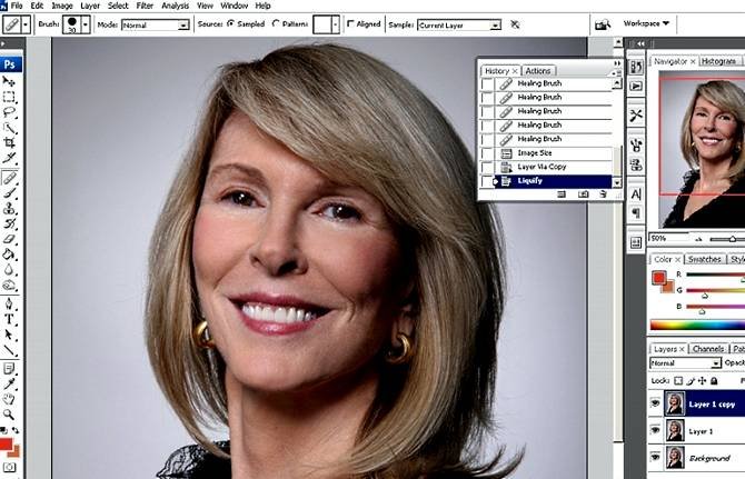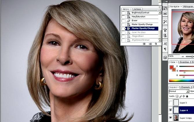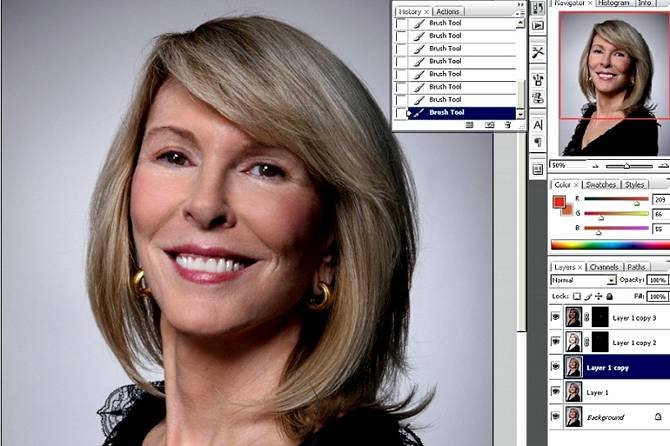 | Как сделать моложе человека на фотоВ этом уроке Фотошопа мы рассмотрим как можно сделать человека моложе на фотографии. Как часто я натыкаюсь на Фотошоп обработку фотографий женщин в возрасте в попытке сделать их моложе. Что для незнающего значит омолодить? Убрать абсолютно все морщины, часто вместе с веками, щеками и др. Для того чтобы человек выглядел моложе. но не выглядел жертвой перефотошопа, приходится изучить особенности возрастного изменения лица, кожи. Для урока я взяла вот эту фотографию: ![]() Открываю фотографию, по которой буду ориентироваться - тут такой же примерно наклон головы, улыбка. ![]() Первым делом беру инструмент Healing Brush Tool (Инструмент «Восстанавливающая кисть» / Клавиша «J») и выравниваю те места, что ровные и на 2 фото, остальное оставляю (складки в уголках, складки от улыбки). ![]() Дальше иду в Filter - Liquify (Фильтр - Пластика) и поправляю черты лица женщины - поднимаю вверх брови (с возрастом брови опускаются немного ниже), поднимаю наружные углы глаза (с возрастом верхнее веко начинает опускаться и давить на внешний угол глаза, отчего он опускается), поднимаю верхнее веко, выравниваю контур нижней челюсти и левый контур лица (с возрастом щеки, скулы обвисают), выравниваю и увеличиваю губы (с возрастом губы становятся меньше). ![]() Далее пользуюсь техникой dodge&burn: создаю две копии картинки, на одной «curves» (Кривые) задираю вверх, на другой вниз, создаю для каждой маску, заливаю ее черным и беру белую кисточку небольшой 1 прозрачности. Там, где яркость фотографии увеличена, кисточкой пройдясь в нужных местах, осветляю, там где уменьшена - затемняю. Кисточкой с маленьким радиусом рисую по морщинам, чтобы их осветлить, сделать менее глубокими. ![]() Потом сливаю слои, делаю копию, захожу в фильтр Filter - Imagenomic - Portraiture (Фильтр - Imagenomic - Portraiture), выставляю все настройки на максимум и получаю вот такого воладнеморта: ![]() Накладываю на этот слой маску, и рисую белой кисточкой по морщинам. Вот как выглядит моя маска: ![]() И результат после нее: ![]() Так как верхнее веко привести в порядок нереально, я беру это самое верхнее веко с фотографии №2, юной улыбчивой девушки, и вставляю нашей многострадальной женщине, подогнав цвета: ![]() Чуть подкрутила Brightness/Contrast (Яркость/Контрастность) и готово. ![]() Вот и все. ![]() |