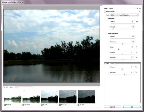 | Создаем HDR-эффект в Photoshop CS5, а так же псевдо HDR ToningВ этом уроке Фотошопа я покажу вам как снимать и обрабатывать HDR-фотографии в Фотошопе. Многие из вас, разумеется, уже знакомы с HDR-изображениями. HDR расшифровывается как high dynamic range (высокий динамический диапазон). Это техника, которая используется для совмещения фотографий, снятых с различными значениями экспозиции. В этом уроке мы обсудим, что это такое и каким образом сделать несколько фотографий с разными экспозициями, а затем объединить их в одно HDR-изображение. Мы также поговорим о псевдо HDR-эффекте, называемом «HDR toning», для которого вам потребуется всего одна фотография. Итак, давайте начнем! Основная причина, по которой многие прибегают к HDR обработке – это съемка при сложном освещении, когда нам нужно запечатлеть все освещенные и затемненные области без пересветов или провалов, сохраняя все детали как в светлых, так и в темных областях. Перед вами 3 фотографии, которые служат отличным примером для создания HDR-изображения: ![]() 1 – переэкспонированная фотография; 2 – фотография с нормальной экспозицией; 3 – недоэкспонированная фотография; Объективно – из этих трех фотографий, фотография номер 2, смотрится довольно неплохо, но, тем не менее, на ней присутствуют пересвеченные области и небольшие провалы на темных участках. Именно поэтому в данном случае нам понадобятся фотографии с различной экспозицией, чтобы совместить их в одно HDR-изображение. Техника съемки таких фотографий называется «брекетинг», т.е. съемка одной композиции с различными экспозициями. Если у вас DSLR-камера, то производить съемку рекомендуется в ручном режиме, изменяя только выдержку, при этом фокус и диафрагма остается неизменными. В этом примере автор использует 5 фотографий, сделанных с различной экспозицией. Перед нами 5 кадров, снятых с различной выдержкой: ![]() Мы видим, что значение выдержки у первого файла = 1/40 сек. Значение выдержки у второго кадра = 1/80 сек, у третьего – 1/160 сек, у четвертого – 1/400, у пятого, недоэкпонированного кадра – 1/800 сек. Это все, что нам нужно для создания HDR-изображения. Еще одно маленькое замечание – если вы снимаете подряд несколько кадров, то желательно, чтобы ваш фотоаппарат был закреплен на штативе. Старайтесь изменять значение экспозиции и делать кадры достаточно быстро, поскольку пейзаж, который вы снимаете, может изменятся (например, плывущие облака). На некоторых DSLR-фотоаппаратах есть функция автоматического брекетинга, при котором фотоаппарат делает серию кадров, изменяя значения выдержки автоматически, но это, конечно же, зависит от модели вашего фотоаппарата. Если у вас нет этой функции, то вы вполне можете изменять экспозицию вручную. Для тех, кто не понял о чем идет речь, поясню более подробно – вам нужно отснять несколько кадров с различной экспозицией. На фотоаппаратах кнопка, которая за это отвечает обозначается как «+/-», аббревиатура сего действия обозначается «EV». Значение экспозиции изменяется от – 2 EV до +2 EV. Шаг зависит от модели вашего фотоаппарата, обычно это 1/3. Вам нужно сделать несколько кадров, например, со значениями –2 EV, -1 EV, 0 EV, +1 EV, +2 EV. Итак, Вы отсняли нужное количество кадров. Открываем Фотошоп и выбираем через меню File - Automate - Merge to HDR Pro (Файл - Автоматизация - Объединить в HDR Pro): ![]() В открывшемся окошке вам будет предложено выбрать файлы, из которых вы хо