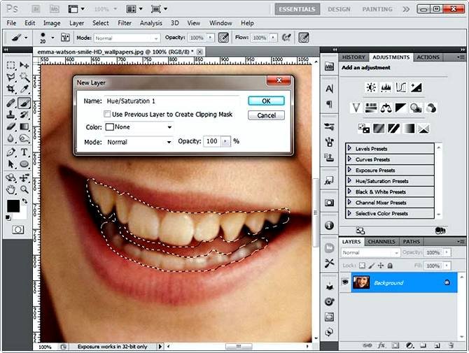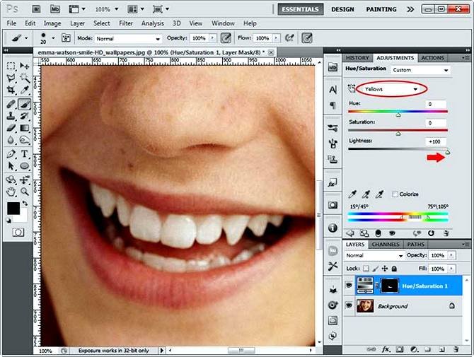 | Как отбелить зубы на фотоВ этом уроке мы рассмотрим, как можно быстро и просто отбелить зубы на фото. 1. Открываем фотографию с моделью, на которой нам нужно ей/ему отбелить зубы. Выбираем на панели инструментов (в самом низу) «Quick Mask Mode» (Редактировать в режиме «Быстрая маска») или жмем клавишу Q. ![]() 2. Затем выбираем инструмент Brush Tool (Инструмент «Кисть» / Клавиша «B») и закрашиваем зубы. Особо стараться не нужно, ничего страшного, если вы закрасите губы, язык или десны. Поэтому этот способ и называется «Быстрое отбеливание зубов», так как не нужно точно выделать зубы. ![]() 3. Затем выходим из «Quick Mask Mode» (Режим быстрой маски) нажав «Q» и получаем выделение. После Layer - New Adjustment Layer - Hue/Saturation (Слои - Новый корректирующий слой - Цветовой тон/Насыщенность) в открывшемся окне жмём Ok. ![]() 4. В панели Adjustments (Окно - Коррекция), в Hue/Saturation (Цветовой тон/Насыщенность) выбираем Yellows (Желтый) или Alt+4. Lightness (Яркость) делаем 100%. ![]() Если нужно сделать эффект сильнее, сделать зубы белее, то можно продублировать слой Hue/Saturation (Цветового тона) (Ctrl+/). Вот и все. ![]() |