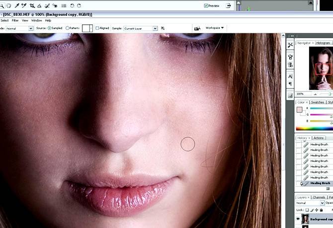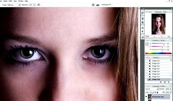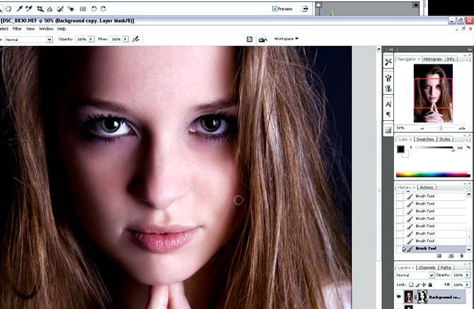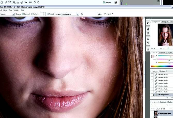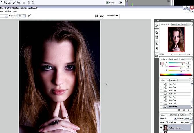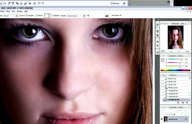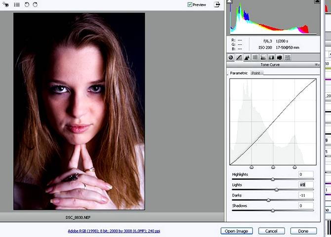 | Ретушь RAW файлов: От и ДоВ этом уроке я не собираюсь открывать вам Америку, тут просто показан процесс обработки отснятого вами материала. Надеюсь, урок будет вам полезен и интересен. В качестве жертвы я выбрала свою подругу. Даже у красавиц есть недостатки которые лучше скрыть на художественном фото. Так что мы будем избавляться от прыщиков и неровностей кожи, выкручивать красивые цвета, подчеркивать достоинства и всячески украшать наш снимок. Для работы с RAW файлами можно воспользоваться большим количеством плагинов и программ. Я работаю в Camera RAW. Это достаточно популярный плагин для фотошоп (начиная с Photoshop CS3 встроен в программу). Скачать можно с сайта www.adobe.com Примечание: Советую использовать версии выше CS2. Интерфейс и функции намного удобнее. Открываем наш raw файлик в фотошоп и видим перед собой интерфейс Camera RAW: Работа с RAW файлом намного удобнее и пластичнее чем c JPEG форматом. Поработав в Camera RAW, вы это по достоинству оцените достаточно быстро. И так, начинаем работу с сырым материалом! Уже в первой закладке огромное количество настроек: Первая - баланс белого! Тут можно выбрать из стандартного набора или, выбрав Custom (Заказная), при помощи бегунков Temperature и Tint, вручную подобрать нужные вам параметры. Я настраивала баланс белого вручную бегунком температуры. Сделала свой снимок «холоднее». Вторая настройка, которую я использовала это Exposure (Экспозиция). Для своего снимка я немного подняла экспозицию. Третья настройка - Brightness (Яркость). Изменение этого значения как вы уже догадались меняет яркость вашего снимка. И последняя настройка в этой закладке это Saturate (Насыщенность). ![]() Переходим на следующую закладку Tone Curve (Цветовая кривая): В этой закладке выполняется настройка света/тени. Я немного подтянула настройку Lights (Света) и сделала насыщеннее темные тона бегунком Darks (Тени): ![]() Следующая закладка HSL/Grayscale (HSL/Градации серого) - работа с цветами. Тут есть 3 вкладки: В первой вкладке вы можете изменять цвета на вашем снимке. Во второй - менять насыщенность цветов на вашем снимке. Я сделала небольшие настройки: ![]() Последняя закладка помогает управлять яркостью ваших цветов. Это немногие из функций Camera RAW, но на этом я успокоюсь. Нажимаем кнопку Open Image (Открыть изображение), и наше фото загружается непосредственно в Photoshop! Обработку фото я начну с ретуши кожи. Первое, что мы делаем это копируем слой. Так как, если вы накосячите, то можно легко удалить испорченный слой и попробовать снова. С помощью инструмента Healing Brush Tool (Инструмент «Восстанавливающая кисть» / Клавиша «J») удалите прыщики и всякую бяку с кожи. Когда вы убрали каку-бяку со снимка. Слейте слои и скопируйте слой снова. Приступим к ретуши морщинок, неровностей, вызванных неудачно выставленным светом, и мешочков под глазами. На копии слоя с помощью Healing Brush Tool (Инструмент «Восстанавливающая кисть») затирайте все морщинки и прочую дребедень. Не пугайтесь, что ваша модель будет выглядеть как пластиковая кукла. То, что стало ![]() То, что было ![]() Теперь, чтобы лицо девушки смотрелось естественнее, добавьте к верхнему слою маску и черной кистью с мягкими краями и прозрачностью около 20% рисуйте с тех местах, которые вы так старательно затирали лечащей кисточкой. ![]() Сливаем слои и опять копируем. Займемся слегка обветренными губками. На копии слоя, вооружившись Healing Brush Tool (Инструмент «Восстанав