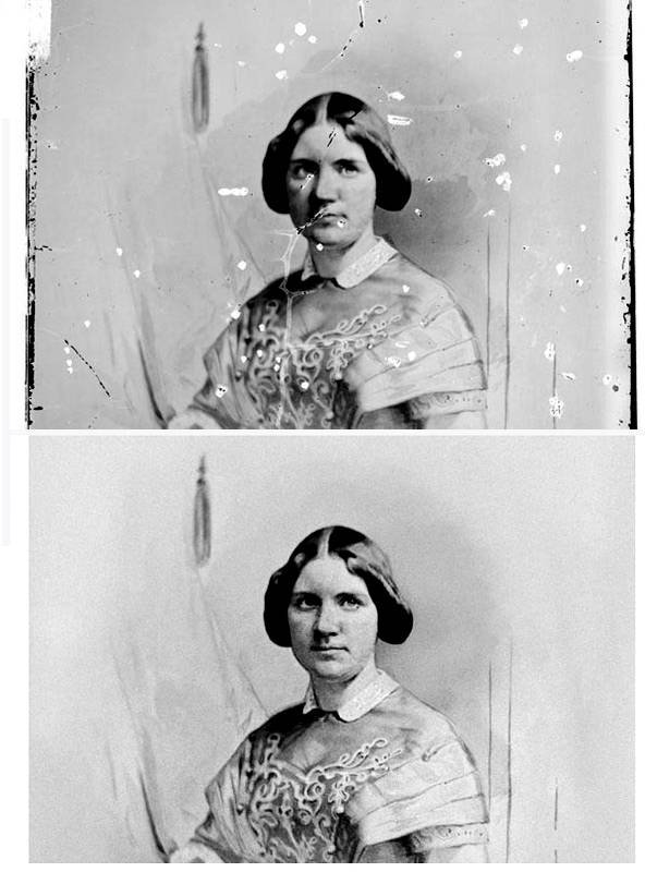 | Убираем царапины, подтеки и пятна со старого фотоВ этом уроке, на примере фотографии (примерно середины 19в.) шведской оперной певицы Дженни Линд, мы научимся убирать трещины, царапины и пятна так, чтобы получить результат нового фото. Мы преднамеренно не будем использовать инструменты быстрого восстановления изображения, специальные плагины и т.п. вещи. Потому что для понимания сути и основ восстановления фото надо все проделать «вручную». Версия Photoshop: Photoshop 7 и выше; Время работы: примерно 4-5 часов; Фото с которым будем работать: ![]() 1. Открываем фото, требующее реставрации, в программе. Получаем слой «Background» (Задний план) и дублируем его. ![]() Двойной клик мышкой по названию полученного дубликата и переименовываем его в «Restoration» (Реставрация). Задний план (первый слой) можно пока спрятать, он понадобиться позже. ![]() 2. Добавляем новый корректирующий Layer - New Adjustment Layer - Levels (Слои - Новый корректирующий слой - Уровни). Устанавливаем параметры как на скрине (черный ставим на 7 и белый на 243). ![]() ![]() 3. Выбираем инструмент Eyedropper Tool (Инструмент «Пипетка» / Клавиша «I») и размер изымаемого образца ставим 5 х 5 рх. ![]() 4. Начинаем ретушировать белые пятна и царапины. Берем мягкую круглую кисть примерно в 21 рх и с нажимом 0, ставим способ смешения кисти на Darken (Затемнение). И начинаем заполнять пустоты (трещины) на фото. ![]() ![]() В этом шаге сложно давать точные указания как и что делать. Вы должны сами определить, что будет лучше для того или иного фото. Общий принцип работы состоит в следующем: набираем пипеткой образец от самого края трещины (в режиме кисти нажимаем и удерживаем + или alt - временное переключение на пипетку, кликаем в нужное место, отпускаем - снова кисть с заданным образцом) и далее этим образцом заполняем пустоты фото. Работать лучше на увеличенном изображении, т.к. чем точнее будет взят образец, тем аккуратнее потом будет выглядеть фото. Обладатели планшета могут выставить в настройках кисти зависимость непрозрачности от нажима пера, а при работе мышкой можно выставить непрозрачность кисти в 50% и постепенно заполнять пустоты. Такой способ работы поможет максимально сгладить границы между областями закраски и оригинальным фото. ![]() ![]() После выполнения этого шага фото выглядит уже более приличным. ![]() 5. Высветляем темные пятна. Процесс работы аналогичен 4 шагу, только режим смешивания для кисти ставим на Lighten (Замена светлым). ![]() По окончании это шага, еще раз смотрим на все фото в целом: и корректируем недостатки незамеченные в начале. Фото теперь должно выглядеть примерно так: ![]() 6. Исправление фона. ![]() ![]() Теперь, используя мягкую круглую кисть в 400-500 рх в режиме Normal (Нормальный) и с непрозрачностью 50-80%, начинаем выравнивать тона фона. Технология как в 4 и 5 шагах (кисть-пипетка-кисть). Ошибки можно исправить ластиком с такими же настройками. Не торопитесь, добейтесь результата, который действительно вас устроит. ![]() 7. Ретушируем лицо. ![]() Чтобы не потерять анатомические детали, можно воспользоваться другим фото в аналогичном ракурсе, проложив по основным линиям направляющие. Поскольку Дженни Линд была известным человеком. то найти такое фото не составило труда. Если такого фото нет, то надо быть очень аккуратным при реставрации, чтобы не убрать ничего нужного. ![]() В данном случае поскольку на исходной фотографии основные черты лица сохранились 
