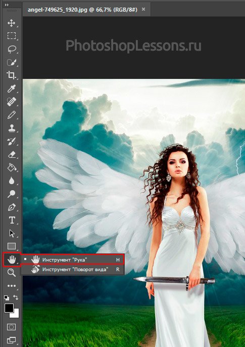 | Инструмент Рука (Hand)В этом уроке мы рассмотрим инструмент «Рука» (Hand Tool), который позволяет быстро и удобно перемещаться по изображению. Умение работать с этим инструментом в связке с другими очень важно, т.к. это значительно ускоряет и упрощает решение различных задач в Фотошопе. Переходим в Фотошоп и открываем любое изображение. Для примера используется фотография, которая доступна тут. Выбираем в панели инструментов пункт ![]() После выбора инструмента сверху становится доступна панель с его настройками. Рассмотрим её. Панель дополнительных настроек инструмента «Рука» (Hand Tool)![]() 1. «Прокрутка во всех окнах» (Scroll All Windows): при включении инструмент начинает прокрутку всех открытых изображений. Посмотрим, как это работает на примере: Откройте второй экземпляр уже открытого изображения, выбрав через меню: Окно - Упорядочить - Новое окно для «название изображения» (Window - Arrange - New Window for). После чего упорядочим отображение окон, выбрав через меню: Окно - Упорядочить - 2 вверх, по горизонтали (Window - Arrange - 2-up Horizontal). Теперь при включенном режиме «Прокрутка во всех окнах» перемещайтесь по изображению с помощью инструмента При этом во втором окне тоже будет происходить перемещение. Используя эту функцию, можно значительно упростить и улучшить свою работу в Фотошопе. Например, при обработке фотографий отслеживать изменения в разных масштабах одновременно. - Открытие нескольких экземпляров одного изображения в Фотшопе. 2. «100%»: при нажатии изменяет масштаб активного окна изображения до 100%. 3. «Подогнать» (Fit Screen): масштабирует активное окно по размеру экрана. 4. «Полный экран» (Fill Screen): масштабирует активное окно на весь экран. Работа с инструментом «Рука» (Hand Tool)Инструмент Для примера: увеличьте масштаб открытого изображения, используя Примечание Теперь возьмите Предположим, для продолжения работы необходимо изменить отображаемый участок изображения. Не меняя инструмента, зажимайте клавишу «Пробел» (Space) и, пока вы её не отпустите, После того, как вы отпустите клавишу «Пробел» (Space), активным снова станет предыдущий инструмент. Таким образом, инструмент Успехов. |