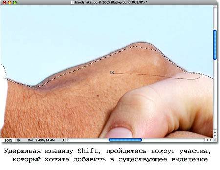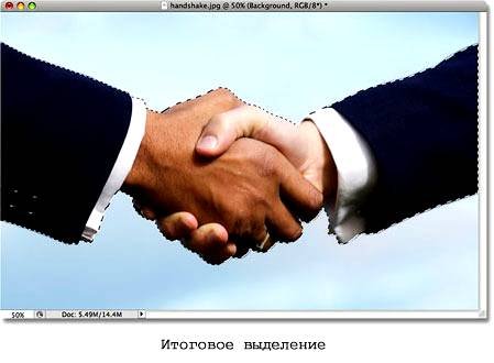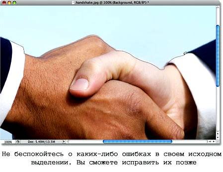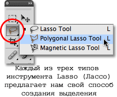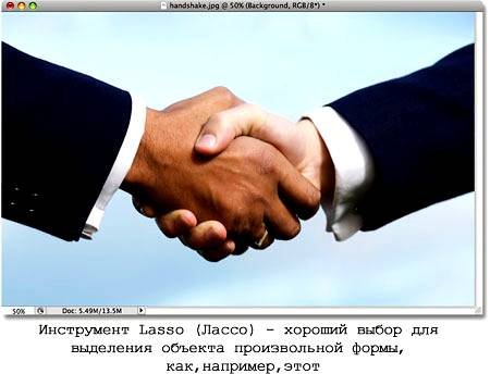 | Инструмент Лассо (Lasso)В этом уроке Фотошопа мы рассмотрим основы работы с инструментом «Лассо». Фотошоп в действительности предлагает нам три варианта лассо для работы. Один из них мы рассмотрим в этом уроке – стандартный инструмент Lasso (Лассо), который вы можете выбрать, кликнув по его иконке в панели инструментов. ![]() Этот инструмент выглядит, как своего рода лассо, которым размахивает ковбой на родео: ![]() Для более быстрого способа выбрать инструмент Lasso (Лассо), просто нажмите букву L на клавиатуре. Есть также два других типа инструментов лассо, такие как Polygonal Lasso (Многоугольное лассо) и Magnetic Lasso (Магнитное лассо), оба спрятаны за стандартным инструментом Lasso (Лассо) в панели инструментов. Мы рассмотрим их в отдельных уроках, но чтобы применить один из них, просто кликните и удерживайте нажатой кнопку мыши на иконке инструмента Lasso (Лассо) до тех пор, пока не появится выпадающее меню, где вы можете выбрать любой из двух инструментов: ![]() Все три инструмента лассо совместно используют букву L для быстрого их вызова, это зависит от того, какие настройки установлены у вас в Preferences (Установках), вы можете переключаться между тремя инструментами либо нажав клавишу L повторно, либо нажав Shift+L. Рисование произвольных выделенийИз всех инструментов выделения в Фотошоп, инструмент Lasso (Лассо), пожалуй, самый легкий в использовании и понимании, поскольку вы просто проводите произвольное выделение вокруг объекта или участка, который хотите выделить, таким же образом, как вы бы рисовали что-то на кусочке бумаги ручкой или карандашом. При активном инструменте Lasso (Лассо), ваш курсор мыши превратиться в маленькую иконку в виде лассо, а вы просто нажмите на точку в документе, откуда хотите начать выделение, затем продолжите, удерживая нажатой кнопку мыши, рисовать произвольную линию выделения: ![]() Чтобы завершить выделение, просто вернитесь в точку, откуда вы начали, и отпустите кнопку мыши. Совершенно не обязательно возвращаться в ту самую точку, с которой вы начали, но если этого не сделать, Фотошоп автоматически закроет выделение за вас, нарисовав прямую линию от точки, где вы отпустили кнопку мыши, до точки, с которой вы начали, поэтому в большинстве случаев, вы захотите закончить выделение там, где вы его начали: ![]() Сказать, что инструмент Lasso (Лассо) не самый точный из инструментов выделения в Фотошоп было бы преуменьшением, но его полезность значительно возросла с возможностью Фотошоп add to (добавлять) и subtract from (удалять из) выделения. Я нахожу лучшим способом работы с инструментом Lasso (Лассо) – проведение исходного выделения вокруг объекта или участка, который я выделяю, игнорируя любые очевидные ошибки, которые я совершил, затем возвращение назад и устранение проблемных участков путем добавления или удаления из области того, что мне нужно. Вот фото двух людей пожимающих руки, которое в данный момент открыто на моем экране. Я хочу выделить рукопожатие и поместить его в другое изображение: ![]() Чтобы начать выделение, я для начала выбираю инструмент Lasso (Лассо) в панели инструментов, как вы видели ранее. Затем я кликаю где-то вверху рядом с рукавом человека слева, чтобы начать выделение, хотя в действительности нет разницы, где около объекта вы начнете свое выделение с помощью инструмента Lasso (Лассо). Как только я кликнул по начальной точке, я продолжаю 