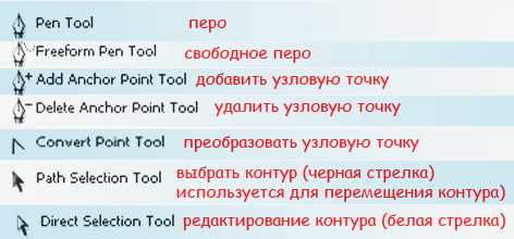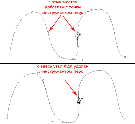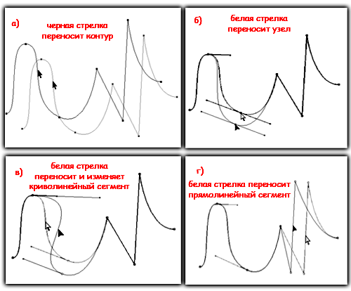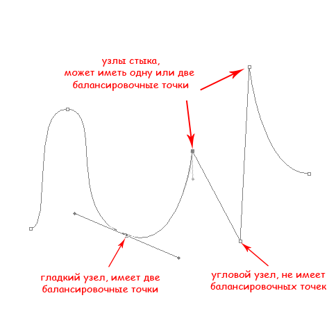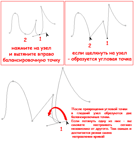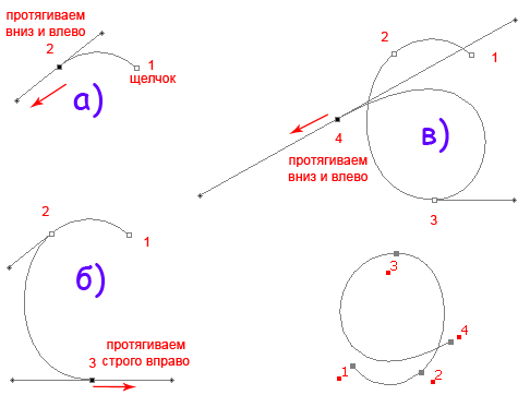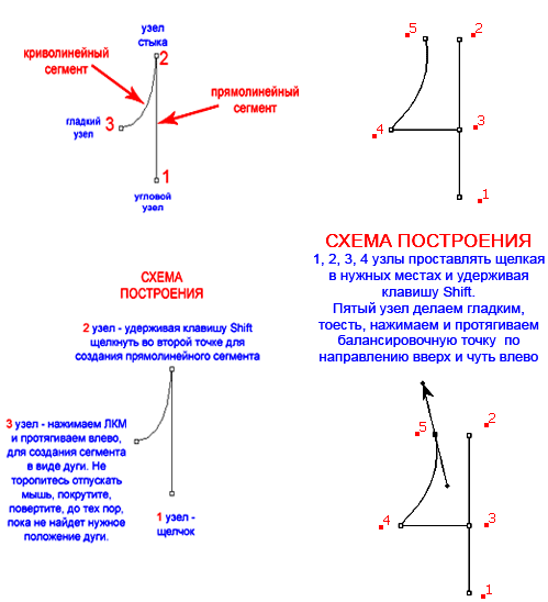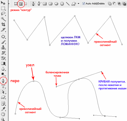 | Инструмент Перо (Pen Tool)Перо в Фотошопе применяется как основной инструмент для создания контуров и векторных объектов, методом поточечного вычерчивания. Режим создания определяется на панели параметров. ![]() Некоторые хитрости помогут вам освоить перо в Фотошопе. Для тренировки создайте документ 600 х 600 px, разрешение 150, фон белый: ![]() Для работы с «контурами» используют эти инструменты: ![]() ![]() Для начала нужно запомнить следующее: Если просто щелкать этим инструментом по холсту, то образуется ломанная линия, состоящая из прямых отрезков и угловых точек (узлов). А если нажать Левой Кнопкой Мыши (ЛКМ) и протянуть - получите кривую Безье, с возможностью настройки ее кривизны. В данном случае, узлы будут гладкими. Кривые Безье - задаются с помощью положения узлов и касательных (рычагов), которые соединяют направляющие и узловые точки. Процесс создания кривой Безье: Сначала устанавливают начальную точку, а затем, двигая мышь, создают направляющие точки и рычаги, с помощью перемещения которых можно задавать кривизну и направление изгиба линии. Давайте попробуем: Включите инструмент «перо», включите режим «контур» и выполните 1-й пример (вверху). Затем нажмите клавишу Esc (чтобы закончить вычерчивание первого контура) и выполните ниже 2-й пример: ![]() При вычерчивании контура инструментом «перо», вы можете добавлять узлы привязки или удалять их. Для этого в процессе создания контура подведите инструмент к ранее созданному узлу, и вы увидите значок «минус» – щелкнув им на узле – можно удалить ненужную точку (Перо с минусом не разрывает контур. Для разрыва контура нужно выделить узел и нажать Delete). Чтобы добавить узел привязки – щелкните «пером» в нужном месте сегмента (возле значка перо появляется «плюс»). ![]() В нарисованных контурах различают узлы: гладкий, угловой и узел стыка. Гладкий узел – обеспечивает плавный переход от одного сегмента к другому в виде единой дуги. Угловой узел – представляет угол между двумя прямыми сегментами и не имеет настроечных балансировочных точек (их еще называют маркеры Безье). Такой узел может только перемещаться. Балансировочные точки позволяют изменять степень кривизны сегментов, соединяющихся в узловой точке, сглаживать углы контуров, точно обводить криволинейные поверхности. Узел СТЫКА (ОСТРЫЙ узел) – используется в тех местах, когда нужно сделать резкую смену направления кривой или соединить прямолинейный сегмент и криволинейный с резким переходом. ![]() Чтобы работать с узлами вам понадобятся инструменты редактирования и перемещения контуров: ![]() Черная стрелка используется для перемещения всего контура. Для этого: щелкнуть черной стрелкой на линии контура – все узлы выделятся, взять любой узел или за саму кривую и переместить контур в нужное место (см. рисунок а) ниже). При перемещении с клавишей Alt контур будет дублироваться. Чтобы передвинуть только один или несколько узлов – включите белую стрелку, щелкните сначала на контур – появятся узлы. Затем кликните на нужный узел или обведите стрелкой несколько узлов – таким образом, узлы выделяются (Выделенные узлы помечаются инверсным цветом по отношению к фону, не выделенные выглядят как не заполненные квадратики) После этого, ухватите выделенный узел и перетащите его в нужное место. При перемещении вид стрелки изменится (см. рисунок ниже – б)). 