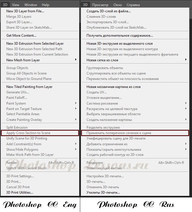 | Перевод 3D - Apply Cross Section to Scene (3D - Применить поперечное сечение к сцене)Перевод и месторасположение 3D - Apply Cross Section to Scene (3D - Применить поперечное сечение к сцене) на примере Photoshop CC (Eng/Rus). На изображении ниже вы можете наглядно увидеть месторасположение и перевод термина 3D - Apply Cross Section to Scene (3D - Применить поперечное сечение к сцене) на примере Английской и Русской версии Photoshop CC (2014). ![]() |