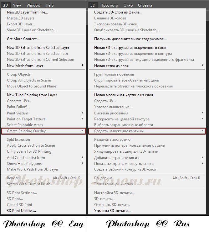 | Перевод 3D - Create Painting Overlay (3D - Создать наложение картины)Перевод и месторасположение 3D - Create Painting Overlay (3D - Создать наложение картины) на примере Photoshop CC (Eng/Rus). На изображении ниже вы можете наглядно увидеть месторасположение и перевод термина 3D - Create Painting Overlay (3D - Создать наложение картины) на примере Английской и Русской версии Photoshop CC (2014). ![]() |