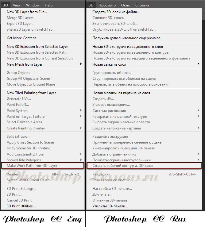 | Перевод 3D - Make Work Path from 3D Layer (3D - Создать рабочий контур из 3D-слоя)Перевод и месторасположение 3D - Make Work Path from 3D Layer (3D - Создать рабочий контур из 3D-слоя) на примере Photoshop CC (Eng/Rus). На изображении ниже вы можете наглядно увидеть месторасположение и перевод термина 3D - Make Work Path from 3D Layer (3D - Создать рабочий контур из 3D-слоя) на примере Английской и Русской версии Photoshop CC (2014). ![]() |