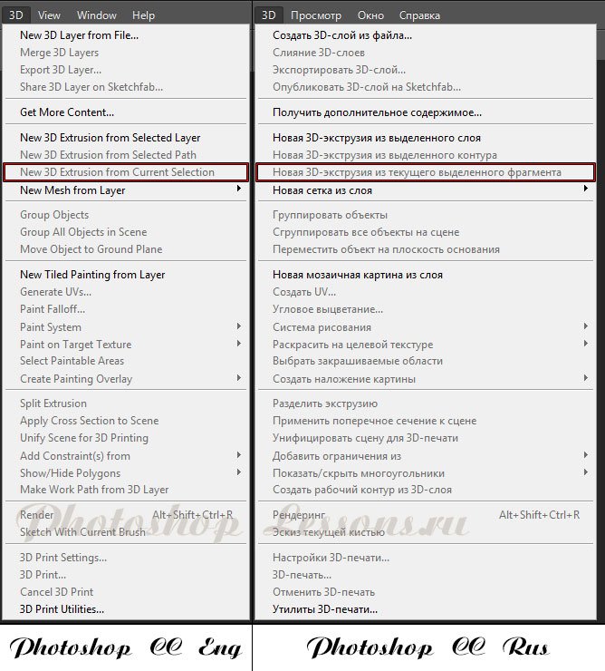 | Перевод 3D - New 3D Extrusion from Current Selection (3D - Новая 3D-экструзия из текущего выделенного фрагмента)Перевод и месторасположение 3D - New 3D Extrusion from Current Selection (3D - Новая 3D-экструзия из текущего выделенного фрагмента) на примере Photoshop CC (Eng/Rus). На изображении ниже вы можете наглядно увидеть месторасположение и перевод термина 3D - New 3D Extrusion from Current Selection (3D - Новая 3D-экструзия из текущего выделенного фрагмента) на примере Английской и Русской версии Photoshop CC (2014). ![]() |