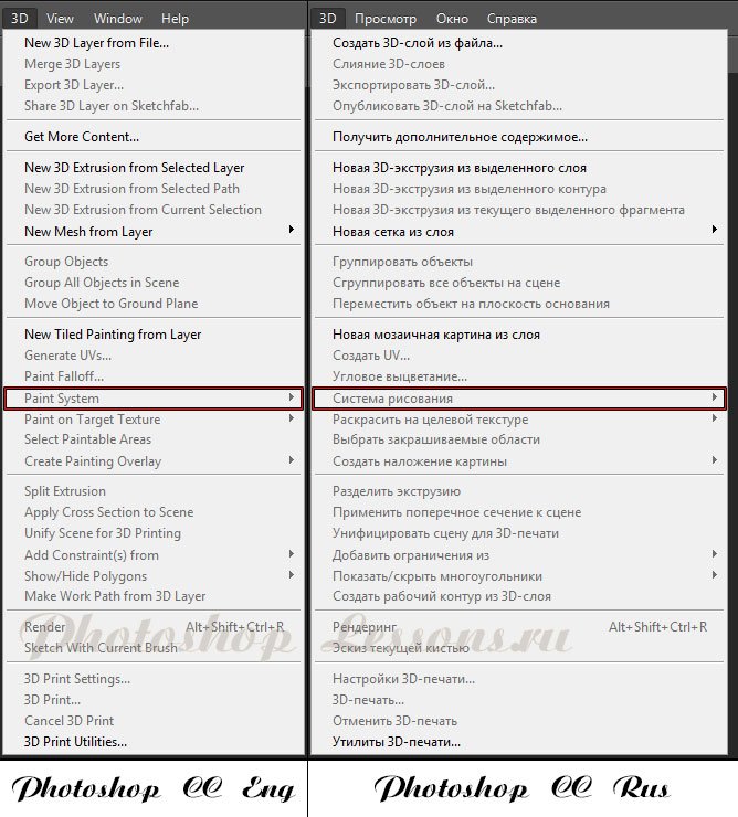 | Перевод 3D - Paint System (3D - Система рисования)Перевод и месторасположение 3D - Paint System (3D - Система рисования) на примере Photoshop CC (Eng/Rus). На изображении ниже вы можете наглядно увидеть месторасположение и перевод термина 3D - Paint System (3D - Система рисования) на примере Английской и Русской версии Photoshop CC (2014). ![]() |