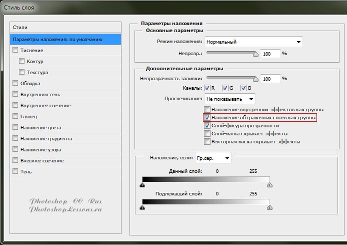 | Blending Option - Blend Clipped Layers as Group (Параметры наложения - Наложение обтравочных слоев как группы)Перевод и месторасположение Blending Option - Blend Clipped Layers as Group (Параметры наложения - Наложение обтравочных слоев как группы) на примере Photoshop CC (Eng/Rus). Узнать как перейти в Blending Option (Параметры наложения / Окно «Стиль слоя» (Layer Style)) можно в материале по ссылке - «Как перейти в Blending Option (Параметры наложения) в Фотошопе». На изображениях ниже вы можете наглядно увидеть месторасположение и перевод Blending Option - Blend Clipped Layers as Group (Параметры наложения - Наложение обтравочных слоев как группы) на примере Английской и Русской версии Photoshop CC (2014). ![]() ![]() |