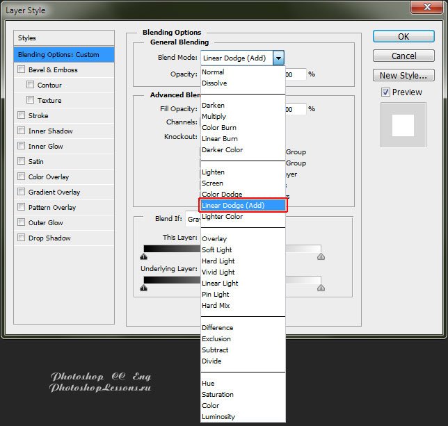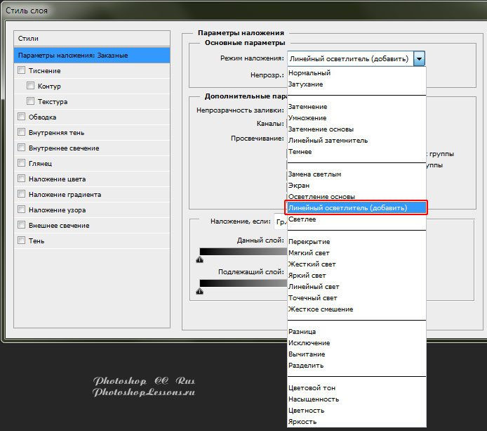 | Blending Option - Blend Mode - Linear Dodge (Add) (Параметры наложения- Режим наложения- Линейный осв. (добавить))Перевод и месторасположение Blending Option - Blend Mode - Linear Dodge (Add) (Параметры наложения - Режим наложения - Линейный осветлитель (добавить)) на примере Photoshop CC (Eng/Rus). Узнать как перейти в Blending Option (Параметры наложения / Окно «Стиль слоя» (Layer Style)) можно в материале по ссылке - «Как перейти в Blending Option (Параметры наложения) в Фотошопе». На изображениях ниже вы можете наглядно увидеть месторасположение и перевод Blending Option - Blend Mode - Linear Dodge (Add) (Параметры наложения - Режим наложения - Линейный осветлитель (добавить)) на примере Английской и Русской версии Photoshop CC (2014). ![]() ![]() Про режимы наложения слоев можно почитать в материале - «Режимы наложения слоев (Blending Modes)». |