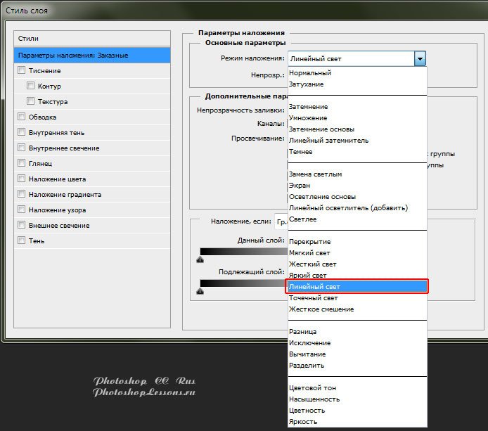 | Перевод Blending Option - Blend Mode - Linear Light (Параметры наложения - Режим наложения - Линейный свет)Перевод и месторасположение Blending Option - Blend Mode - Linear Light (Параметры наложения - Режим наложения - Линейный свет) на примере Photoshop CC (Eng/Rus). Узнать как перейти в Blending Option (Параметры наложения / Окно «Стиль слоя» (Layer Style)) можно в материале по ссылке - «Как перейти в Blending Option (Параметры наложения) в Фотошопе». На изображениях ниже вы можете наглядно увидеть месторасположение и перевод Blending Option - Blend Mode - Linear Light (Параметры наложения - Режим наложения - Линейный свет) на примере Английской и Русской версии Photoshop CC (2014). ![]() ![]() Про режимы наложения слоев можно почитать в материале - «Режимы наложения слоев (Blending Modes)». |