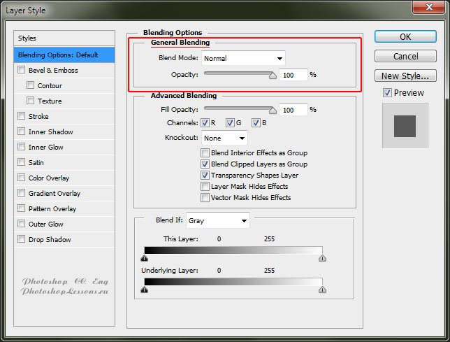 | Перевод Blending Option - General Blending (Параметры наложения - Основные параметры)Перевод и месторасположение Blending Option - General Blending (Параметры наложения - Основные параметры) на примере Photoshop CC (Eng/Rus). Узнать как перейти в Blending Option (Параметры наложения / Окно «Стиль слоя» (Layer Style)) можно в материале по ссылке - «Как перейти в Blending Option (Параметры наложения) в Фотошопе». На изображениях ниже вы можете наглядно увидеть месторасположение и перевод Blending Option - General Blending (Параметры наложения - Основные параметры) на примере Английской и Русской версии Photoshop CC (2014). ![]() ![]() |