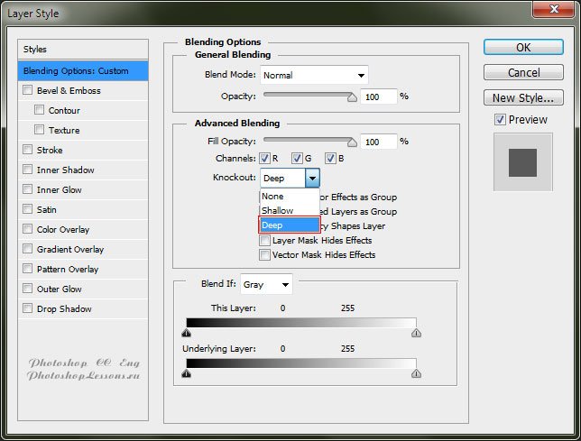 | Перевод Blending Option - Knockout: Deep (Параметры наложения - Просвечивание: Глубокое)Перевод и месторасположение Blending Option - Deep (Параметры наложения - Просвечивание: Глубокое) на примере Photoshop CC (Eng/Rus). Узнать как перейти в Blending Option (Параметры наложения / Окно «Стиль слоя» (Layer Style)) можно в материале по ссылке - «Как перейти в Blending Option (Параметры наложения) в Фотошопе». На изображениях ниже вы можете наглядно увидеть месторасположение и перевод Blending Option - Knockout: Deep (Параметры наложения - Просвечивание: Глубокое) на примере Английской и Русской версии Photoshop CC (2014). ![]() ![]() |