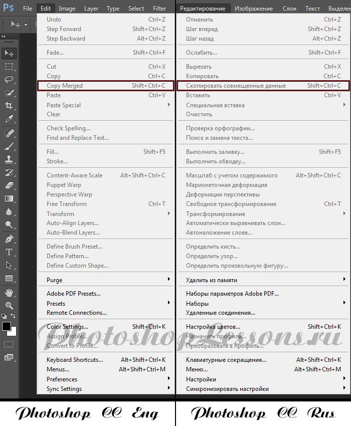 | Перевод Edit - Copy Merged (Редактирование - Скопировать совмещенные данные / Shift+Ctrl+C)Перевод и месторасположение Edit - Copy Merged (Редактирование - Скопировать совмещенные данные) на примере Photoshop CC (Eng/Rus). На изображении ниже вы можете наглядно увидеть месторасположение и перевод термина Edit - Copy Merged (Редактирование - Скопировать совмещенные данные / Сочетание клавиш «Shift+Ctrl+C») на примере Английской и Русской версии Photoshop CC (2014). ![]() |