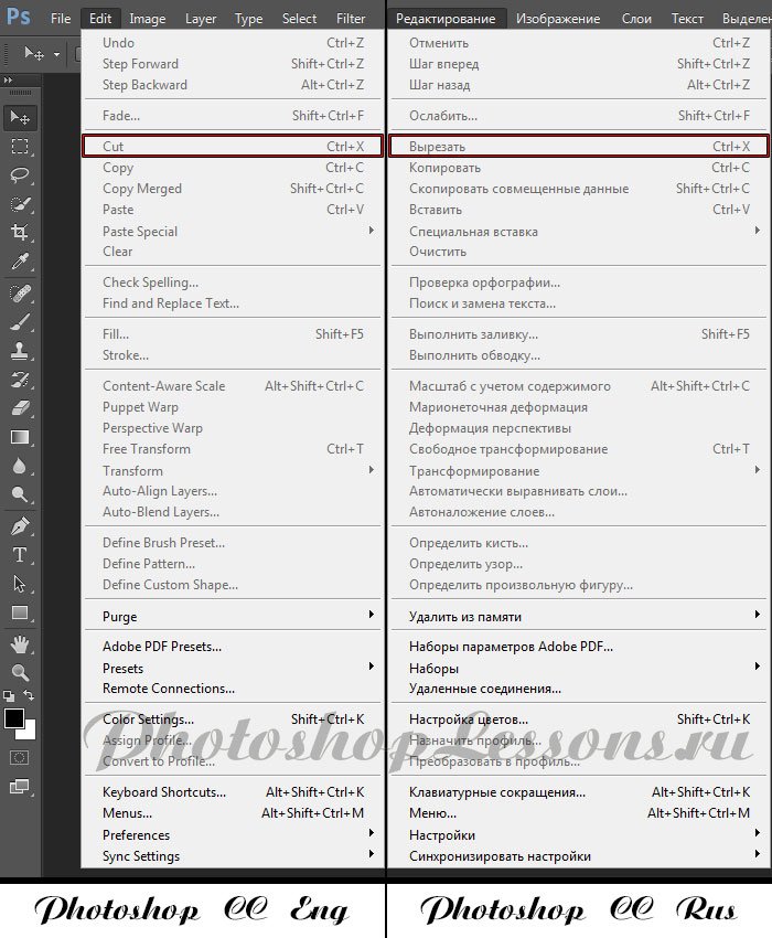 | Перевод Edit - Cut (Редактирование - Вырезать / Ctrl+X)Перевод и месторасположение Edit - Cut (Редактирование - Вырезать) на примере Photoshop CC (Eng/Rus). На изображении ниже вы можете наглядно увидеть месторасположение и перевод термина Edit - Cut (Редактирование - Вырезать / Сочетание клавиш «Ctrl+X») на примере Английской и Русской версии Photoshop CC (2014). ![]() |