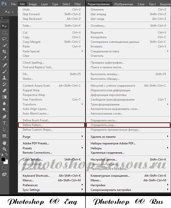 | Перевод Edit - Define Pattern (Редактирование - Определить узор)Перевод и месторасположение Edit - Define Pattern (Редактирование - Определить узор) на примере Photoshop CC (Eng/Rus). На изображении ниже вы можете наглядно увидеть месторасположение и перевод термина Edit - Define Pattern (Редактирование - Определить узор) на примере Английской и Русской версии Photoshop CC (2014). ![]() |