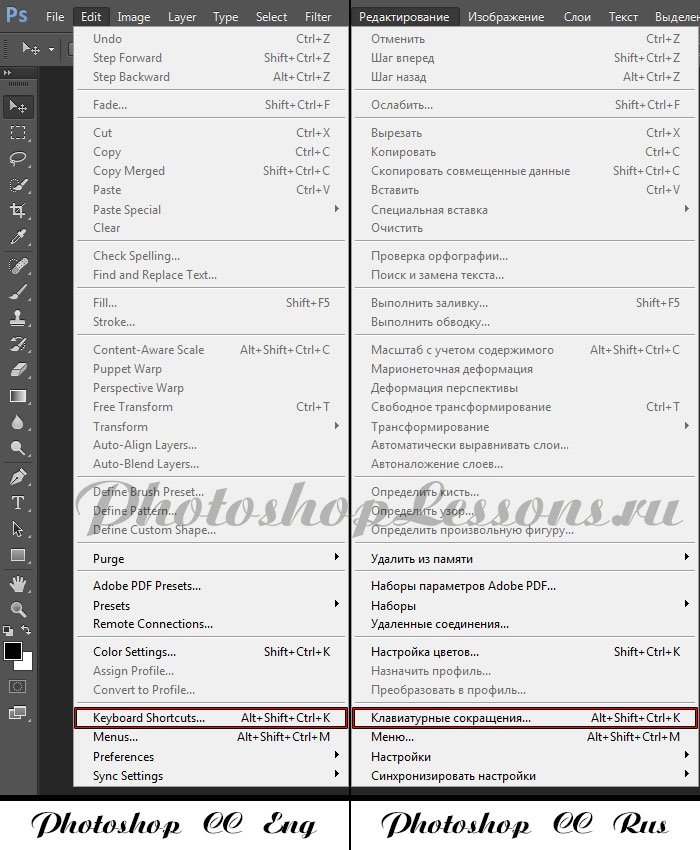 | Перевод Edit - Keyboard Shortcuts (Редактирование - Клавиатурные сокращения / Alt+Shift+Ctrl+K)Перевод и месторасположение Edit - Keyboard Shortcuts (Редактирование - Клавиатурные сокращения) на примере Photoshop CC (Eng/Rus). На изображении ниже вы можете наглядно увидеть месторасположение и перевод термина Edit - Keyboard Shortcuts (Редактирование - Клавиатурные сокращения / Сочетание клавиш «Alt+Shift+Ctrl+K») на примере Английской и Русской версии Photoshop CC (2014). ![]() |