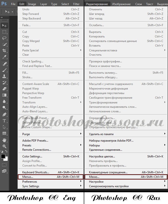 | Перевод Edit - Menus (Редактирование - Меню)Перевод и месторасположение Edit - Menus (Редактирование - Меню) на примере Photoshop CC (Eng/Rus). На изображении ниже вы можете наглядно увидеть месторасположение и перевод термина Edit - Menus (Редактирование - Меню) на примере Английской и Русской версии Photoshop CC (2014). ![]() |