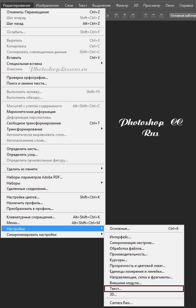 | Перевод Edit - Preferences - Type (Редактирование - Настройки - Текст)Перевод и месторасположение Edit - Preferences - Type (Редактирование - Настройки - Текст) на примере Photoshop CC (Eng/Rus). На изображении ниже вы можете наглядно увидеть месторасположение и перевод термина Edit - Preferences - Type (Редактирование - Настройки - Текст) на примере Английской и Русской версии Photoshop CC (2014). ![]() ![]() |